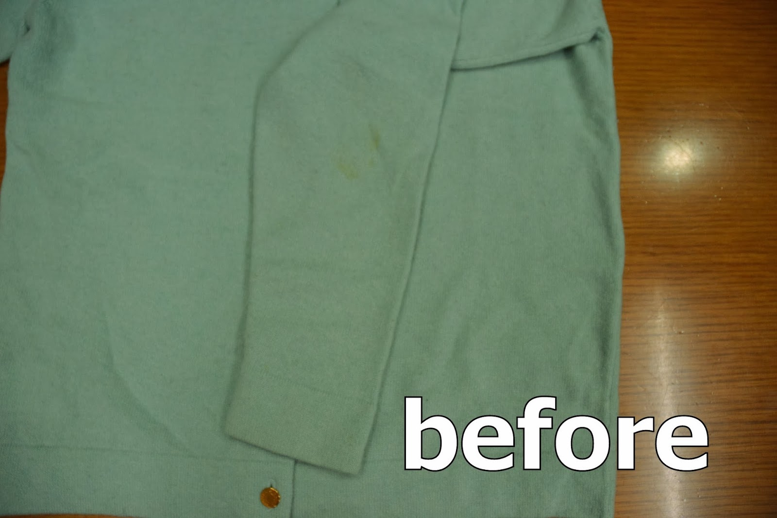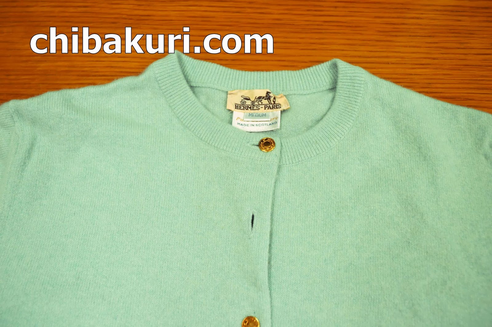 母が10年以上前に着ていたパステルグリーンのエルメスのカーディガンにところどころに黄色いシミがありそれを取って欲しいとのことでした。また仕舞い込んでいたためにシミも10年位前のものとの事。