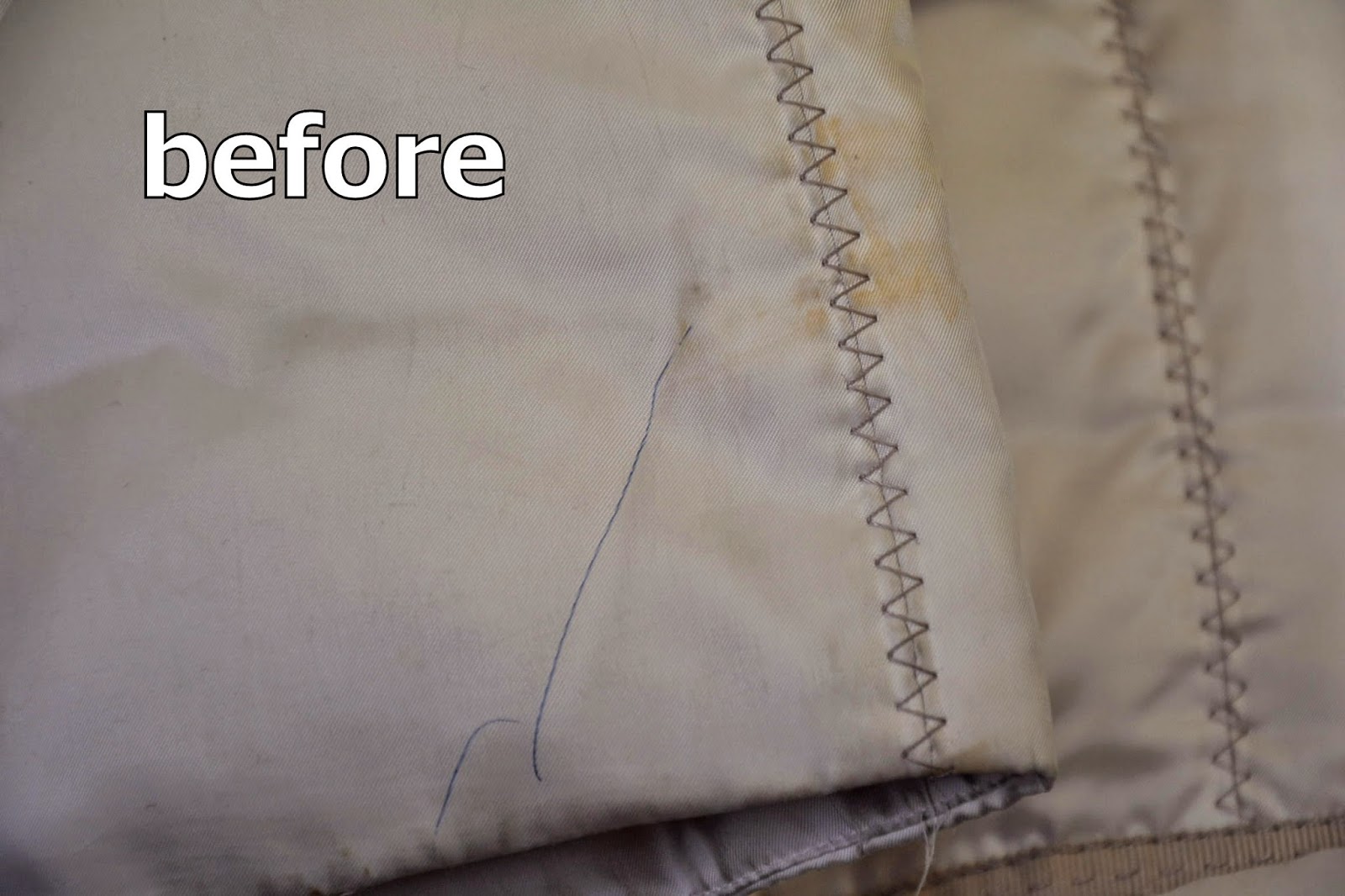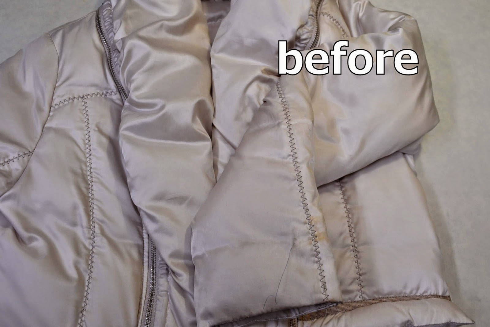 ボールペンの他にも何かのシミもあります。素材は表生地にポリエステル100% 詰め物がダウンとなります。洗剤をつけてこすったり叩いたりしても簡単に取れるものではありません。