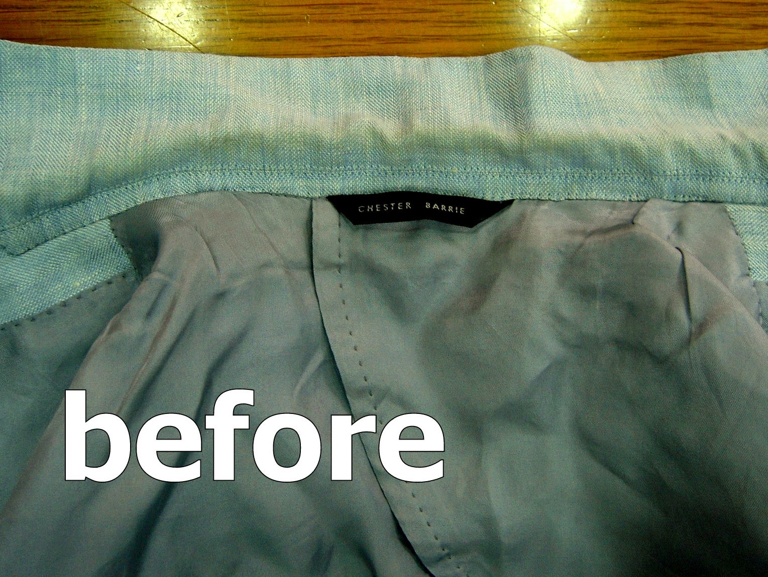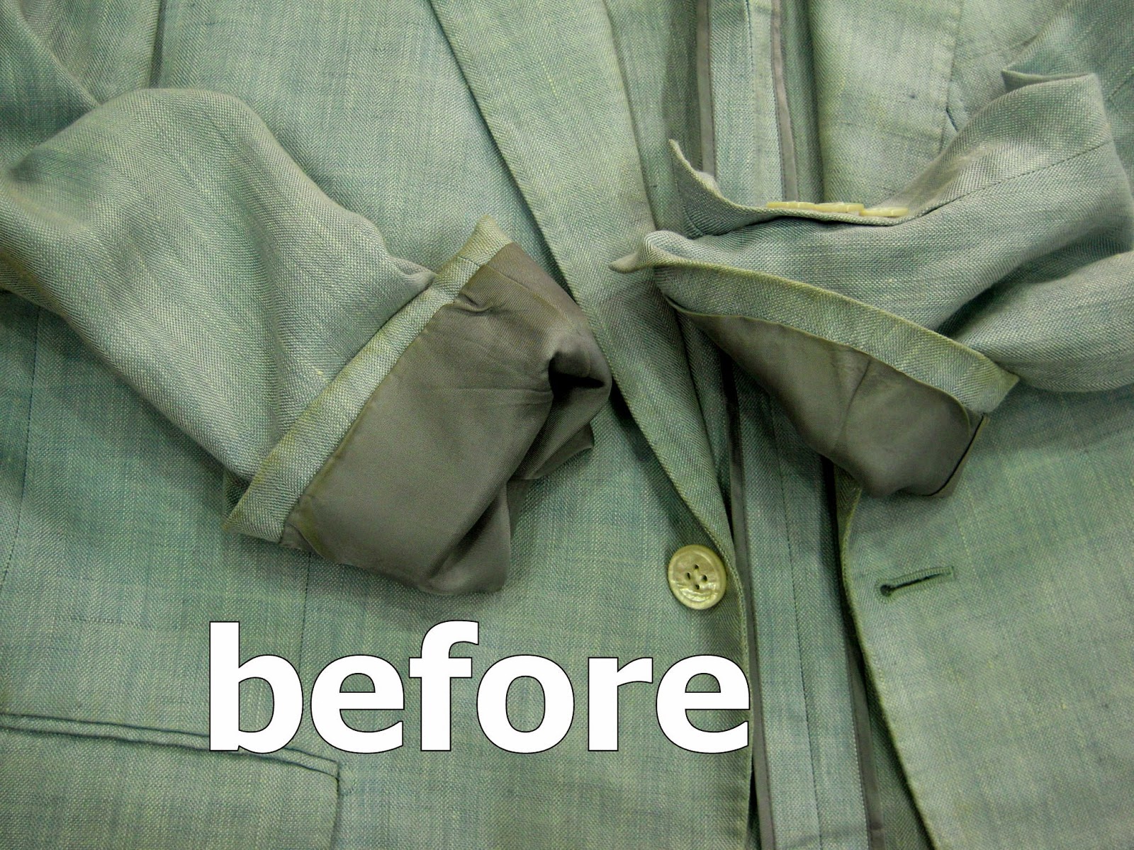 水を使用しなければ落ちなのが、汗です。では、部分的に水で洗えば良いではないかと申しますと、そう言った事もできますがこのジャケットの場合全体に黄ばみが見られ部分的なところだけキレイになってしまい汚れた部分がキレイになってしまいほかがくすんでしまうということになってしまいます。