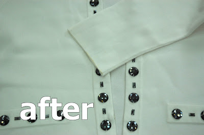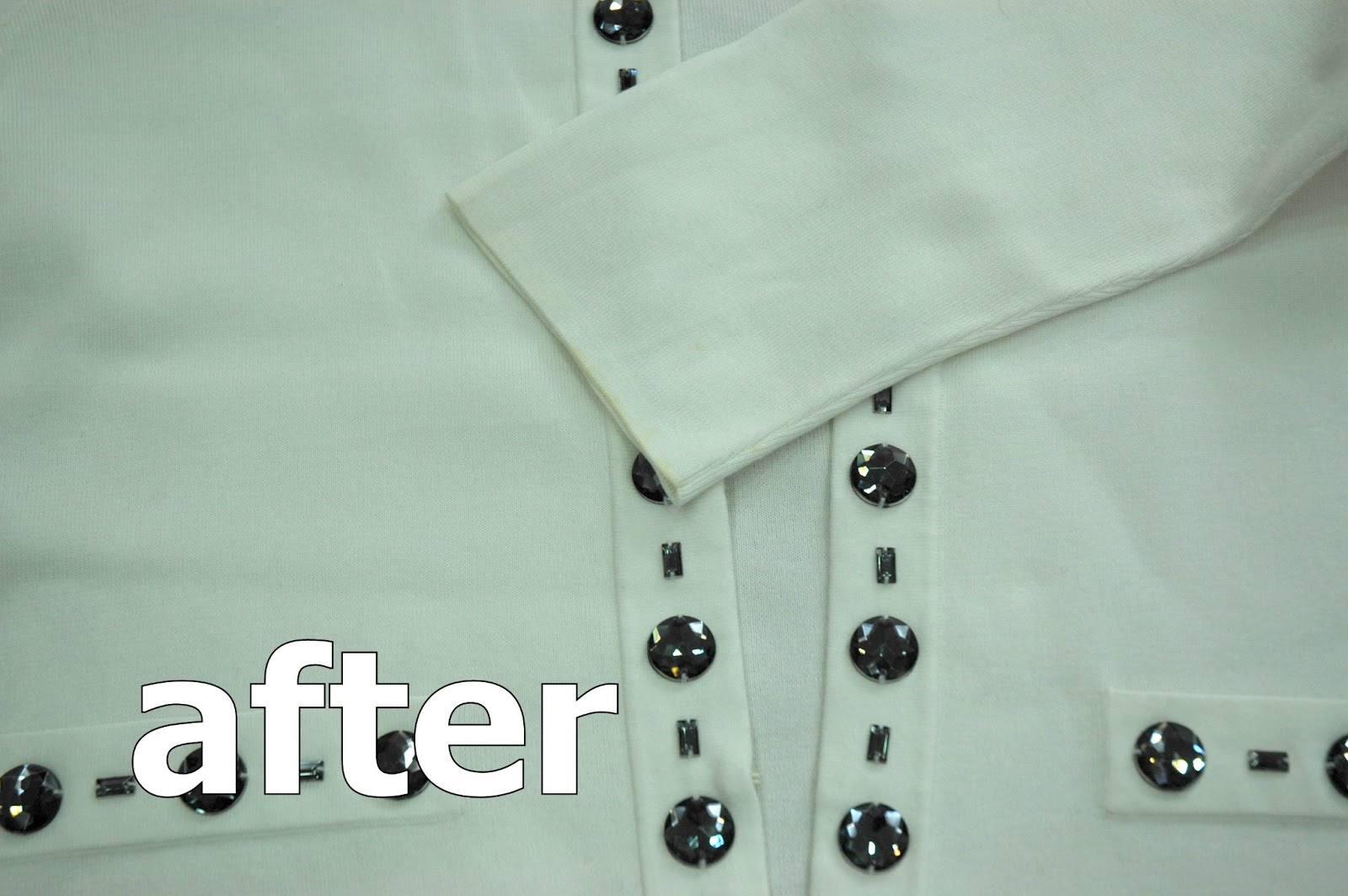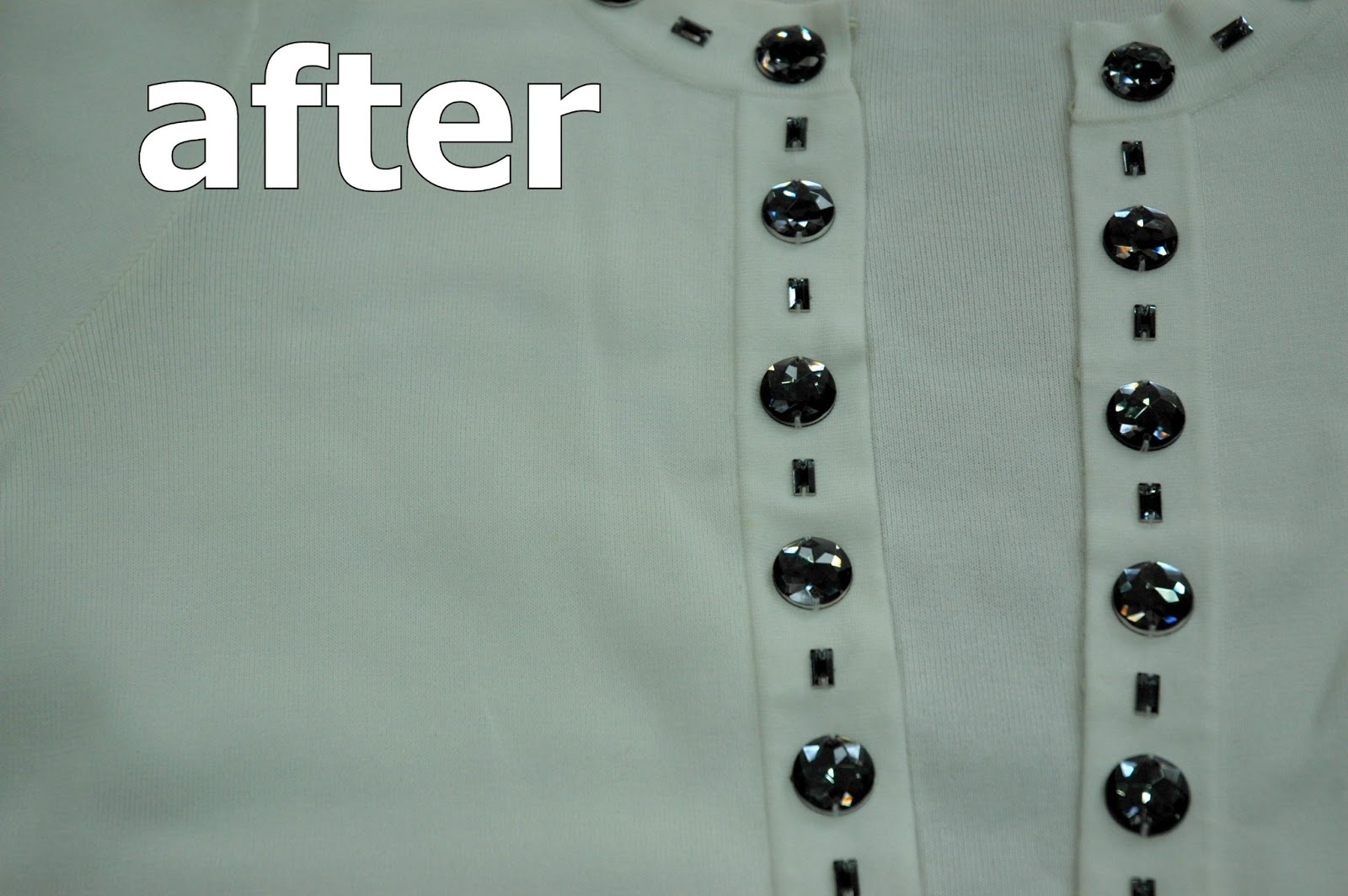 装飾にガラスボタンをあしらったカーディガンのシミ抜きです。