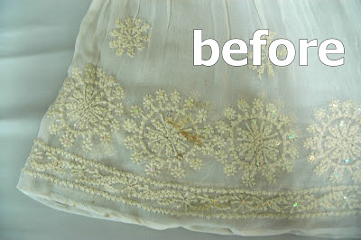 素材的にこういった染みは部分であっても水でもんだりすると輪染みや刺繍部分を壊しやすいです。