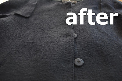 前身頃にできた毛玉の処理です。ニットは摩擦の多いところに毛玉ができます。