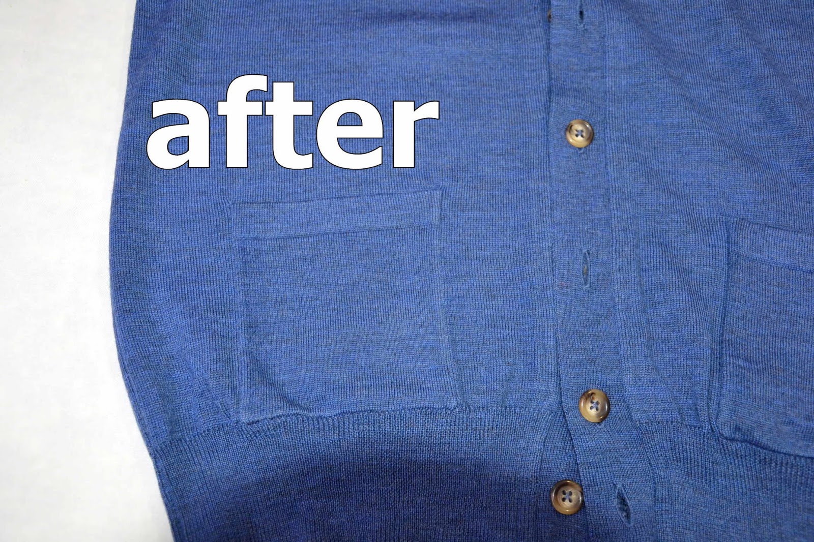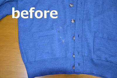 ニットカーディガン チョコレート 染み抜き実例 チョコレートの染み抜きです。毛糸の上で固まっています。脂肪が主ですので熱を加えると溶けます。うまく取り除かないと染み入ってしまいます。お湯などで溶かし出す事もありますが、広がってしまうと厄介です。